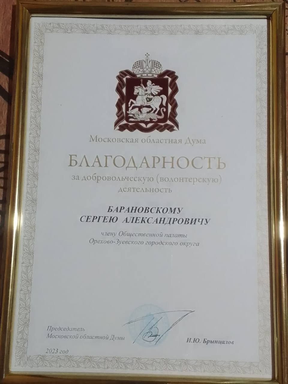 Барановский С.А., член Общественной палаты Орехово-Зуевского г.о., в день рождения своей малой родины – деревни Давыдово, был награжден благодарностью Московской областной Думы «За добровольческую (волонтерскую) деятельность».