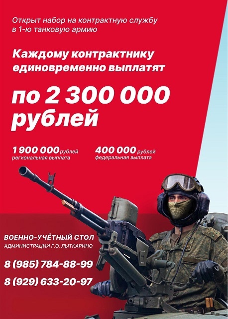 В Лыткарино объявлен набор в легендарную 1-ю танковую армию. Каждый желающий, заключивший контракт на военную службу с Министерством обороны Российской Федерации, может получить единовременную выплату в размере 2,3 миллиона рублей.