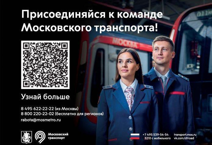 Информацию об актуальных вакансиях и условиях приема на работу можно получить на oфициальнoм сайте, едином транспортном портале, по телефонам (495) 622-22-22 и (800) 220-22-02 ежедневно с 8:00 до 20:00, а также в центре подбора персонала транспортного комплекса по адресам: наземный вестибюль станции метро «Черкизовская»; 2-й ярус станции метро «Выставочная»; станция метро «Нагорная», ул. Криворожская, д. 6, стр. 1. Время работы: понедельник-пятница с 9:00 до 20:00, суббота с 9:00 до 15:00.