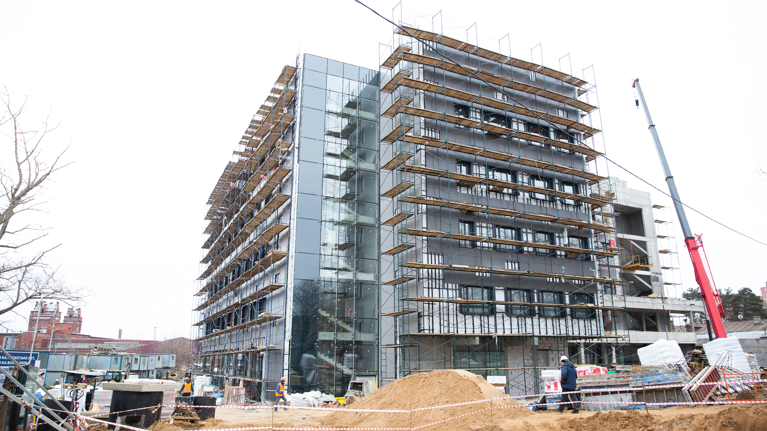 Глава добавил, что в настоящее время строители проводят фасадные работы: утепление, монтаж керамогранитной плитки и витражей. Внутри здания ведутся электромонтажные работы, устройство полов, штукатурка стен, монтаж вентиляции.