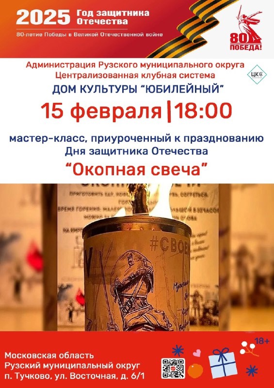Дом культуры «Юбилейный» приглашает всех желающих на мастер-класс «Окопная свеча», 15 февраля в 18.00. Здесь вам покажут технику изготовления блиндажных свечей, которые так необходимы нашим бойца на СВО. Она предназначена не только для освещения и обогрева укрытий, на ней можно готовить пищу, сушить одежду в полевых условиях.