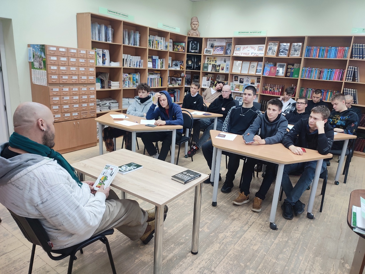 Учащимся показали, как работает книгохранилище, рассказали о профессии библиотекаря. Также их ждала встреча с писателем и музыкантом Павлом Тетериным. Он рассказал о себе и своем творчестве, провел краткий обзор книг «Новый альбом», «Последний альбом», «Бездна».