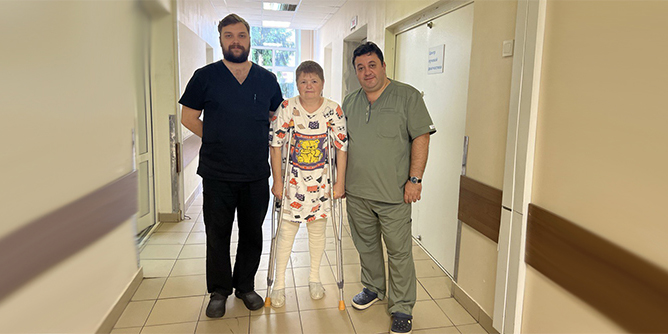 «Конечно, я живой человек, поэтому боялась перед операцией, хотя и сама работаю в больнице. Но все прошло идеально - все в операционной шутили. Анестезиолог-реаниматолог Дмитрий Владимирович Карнов сделал очень хорошую спинальную анестезию, ничего не чувствовала. Операцию проводили травматолог-ортопед Данилкин Егор Сергеевич, он был потом моим лечащим врачом, и заведующий отделением. Арутюну Карбисовичу прямо надо руки застраховать, они у него золотые!», - рассказывала пациентка на следующий день, когда уже бодро передвигалась по коридору на костылях. Костыли - это подстраховка, чтобы рассеченные мягкие ткани правильно зарубцевались, и восстановился естественный биологический каркас вокруг сустава. Через 1-1,5 месяца они сменяются тросточкой, потом - направление в наше отделение реабилитации, где специалисты помогают разработать сустав, и через несколько месяцев пациент возвращается к привычной жизни. Наталья Петровна уверена, что врачей не подведет, и будет очень прилежной пациенткой, постарается реабилитироваться как можно скорее.