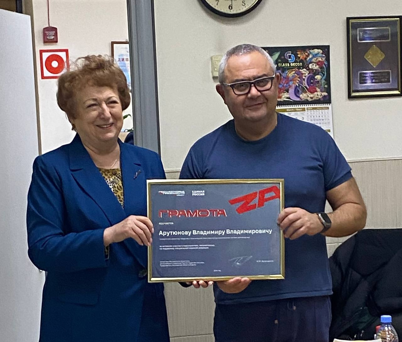 Председатель Совета депутатов, заместитель секретаря местного отделения Партии "Единая Россия" Татьяна Ронзина вручила генеральному директору предприятия Арутюнову Владимиру Владимировичу Грамоту за помощь СВО, поблагодарила за существенный вклад в экономику округа.