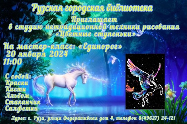 Мастер-класс «Единорог» состоится 20 января в 11 часов в студии нетрадиционной техники рисования «Цветные ступеньки» Рузской городской библиотеки.